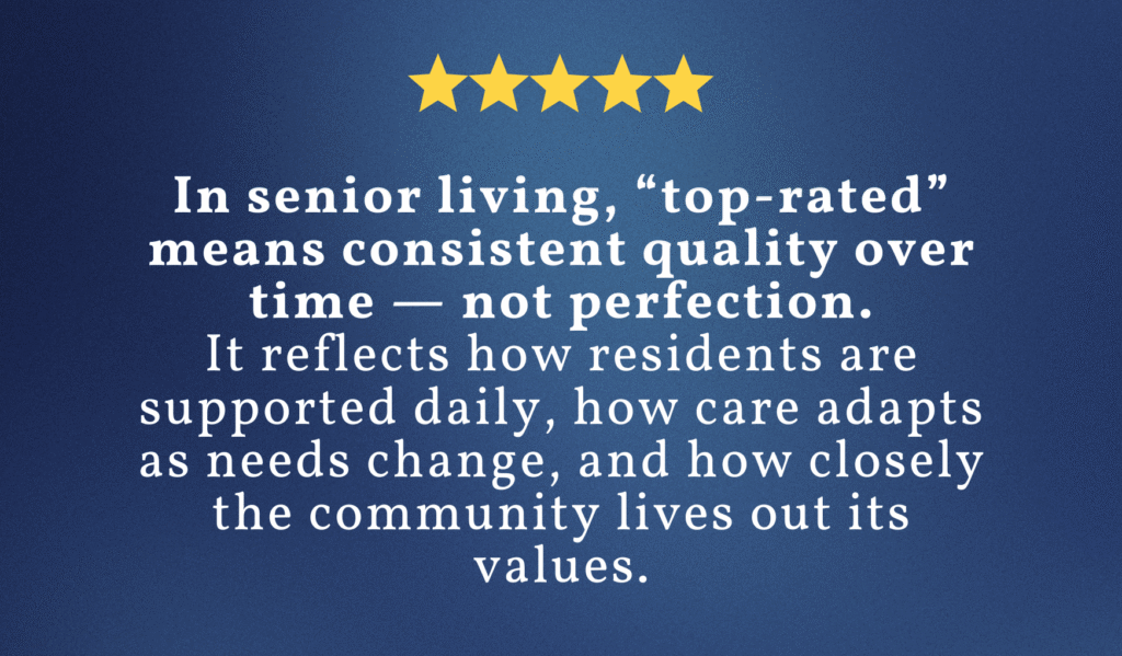 A truly top-rated senior living community is one that delivers quality care consistently over time. The proof exists in how residents are treated, the quality of daily life offered, how associates engage with families, and how care adapts as needs change. In other words, being “top-rated” is less about perfection and more about reliability, trust, and experience.